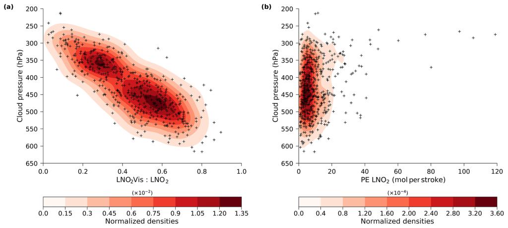 图 2 (a) LNO2Vis与LNO2之比和云压的核密度估计 (b) LNO2产率与和云压的核密度估计