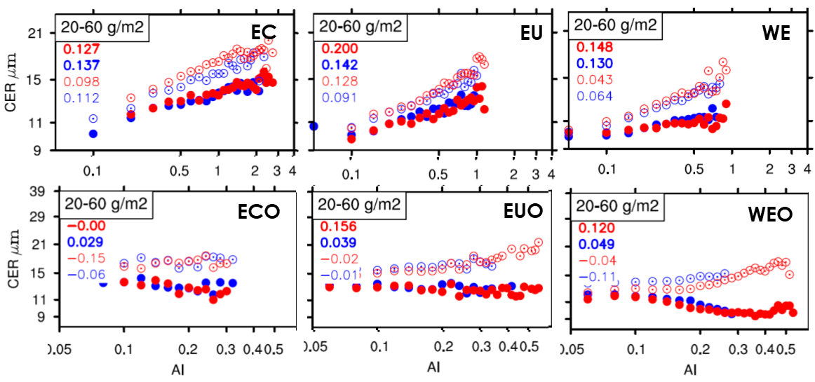 之前大量的研究从飞机观测、地基遥感和卫星遥感的角度均观测到了Twomey 效应,即气溶胶数浓度与云滴有效半径(CER)之间的负相关。此外,也有研究从气溶胶-云相互作用引起的大气顶反照率的改变这一视角,更加直接地确认了气溶胶通过改变云而造成的对地球系统的冷却作用。除了已被广泛证实的 Twomey 效应外,还观测到了 气溶胶光学厚度(AOD)或气溶胶指数(AI)与 CER 之间存在弱相关,甚至在某些区域存在正相关的现象(即,“反 Twomey 效应”)。总体来说, AOD/AI和 CER 在海洋上表现为负相关,而在陆地上则为正相关。以上看似矛盾的关系促使我们进一步探索背后潜在物理原因、或者分析方法和观测手段引起的偏差。