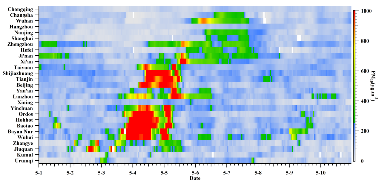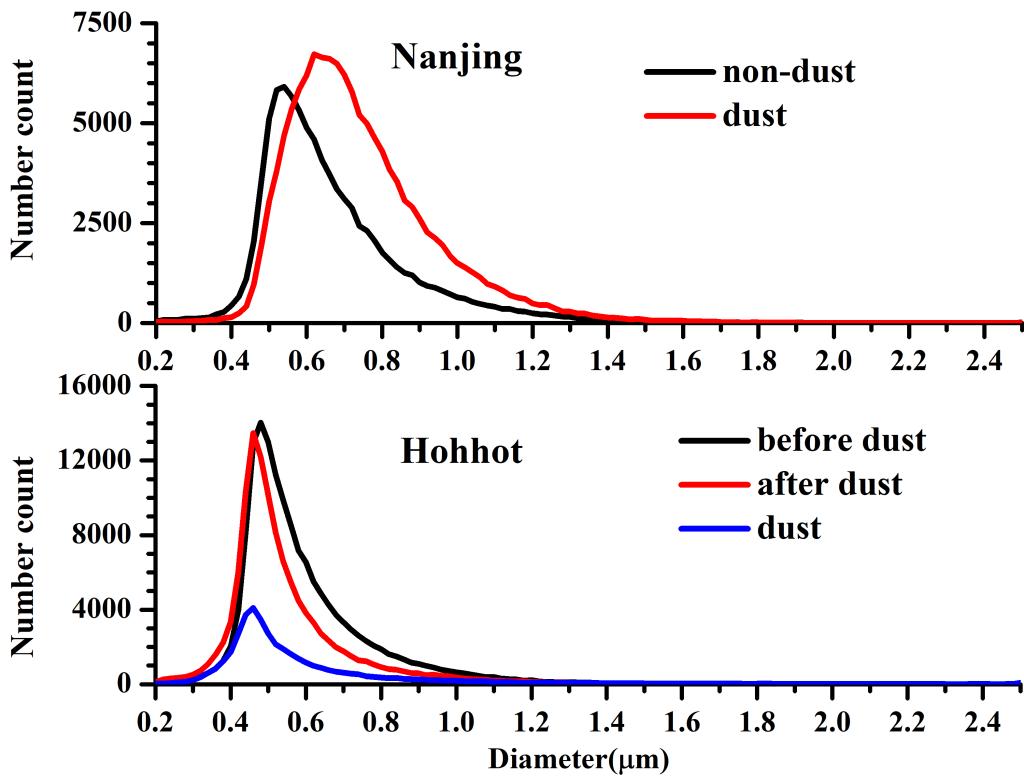 2017 年5月3~8日中国出现一次强沙尘过程,影响面积超过 163万km2。随着蒙古气旋的南下,沙尘远距离输送,罕见的大范围的影响到中国长江中下游地区。使用SPAMS同时在沙尘源区呼和浩特市和远距离输送城市南京对PM2.5中气溶胶颗粒的混合状态和粒径分布进行了实时在线观测。
