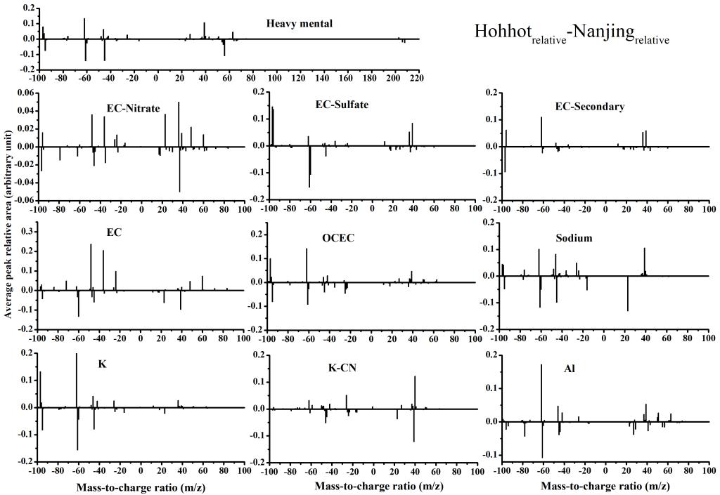 图6 呼和浩特市-南京不同类型气溶胶质谱特征