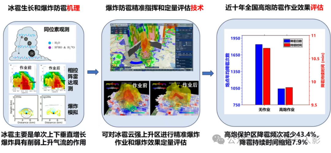 该成果聚焦破解防雹理论与技术难题,通过精密观测和精细模拟等方法,揭示了冰雹增长物理机制和雹云爆炸动力效应,提出并构建了爆炸影响雹云动力结构及影响冰雹生长演化过程的机理模型,凝练了人工防雹作业指标。在此理论基础上,创建了基于相控阵雷达的冰雹监测和爆炸防雹精准作业技术,形成基于观测和爆炸模拟相结合的防雹客观定量效果评估方法,成果在农业防灾减灾、重大科学装置防御等方面做出了重要贡献。