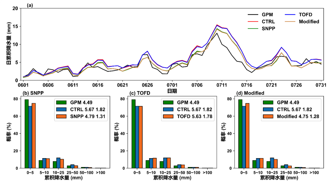 (a) GPM卫星降水产品(GPM)和各敏感性试验的降水序列;(b)~(d) GPM(绿色柱体)、控制试验(CTRL;蓝色柱体)及其他敏感性试验(橙色柱体)对应的日累积降水概率密度分布函数;在(b)~(d)的图例中,第一列数值代表日累积降水量的平均值,第二列数值代表各敏感性试验相较于GPM的均方根误差