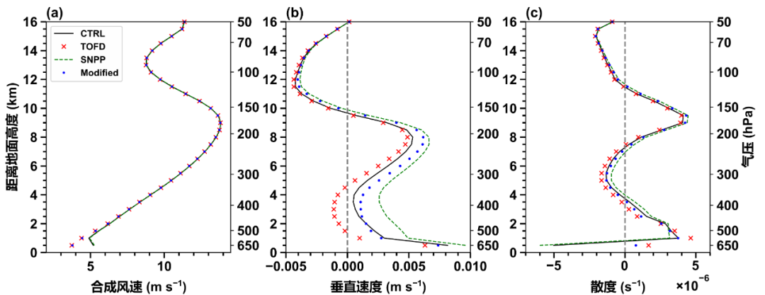 进一步分析表明,优化的对流方案通过增加卷入率(图2),从三个方面有效抑制了研究区域的降水:一是降低云顶高度和云厚,抑制降水粒子在垂直方向的发展,减少总降水量;二是降低深对流事件频率,减少降水事件数量;三是减少对流云中云水含量,降低对流降水强度。地形湍流拖曳方案主要通过减弱喜马拉雅山脉北侧的风速和垂直速度(图3),抑制该区域的云和降水过程。联合使用优化的对流方案与地形湍流拖曳方案可充分发挥二者优势:前者显著缓解了区域性湿偏差,后者改进了降水的空间分布,特别是在高原南坡区域有效弥补了单独应用优化的对流方案时的不足,从而整体提升了对青藏高原降水的模拟能力。
